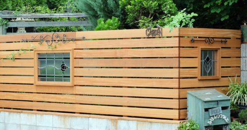 <埼玉県入間郡越生町>ステンドグラスの入った天然木のフェンス