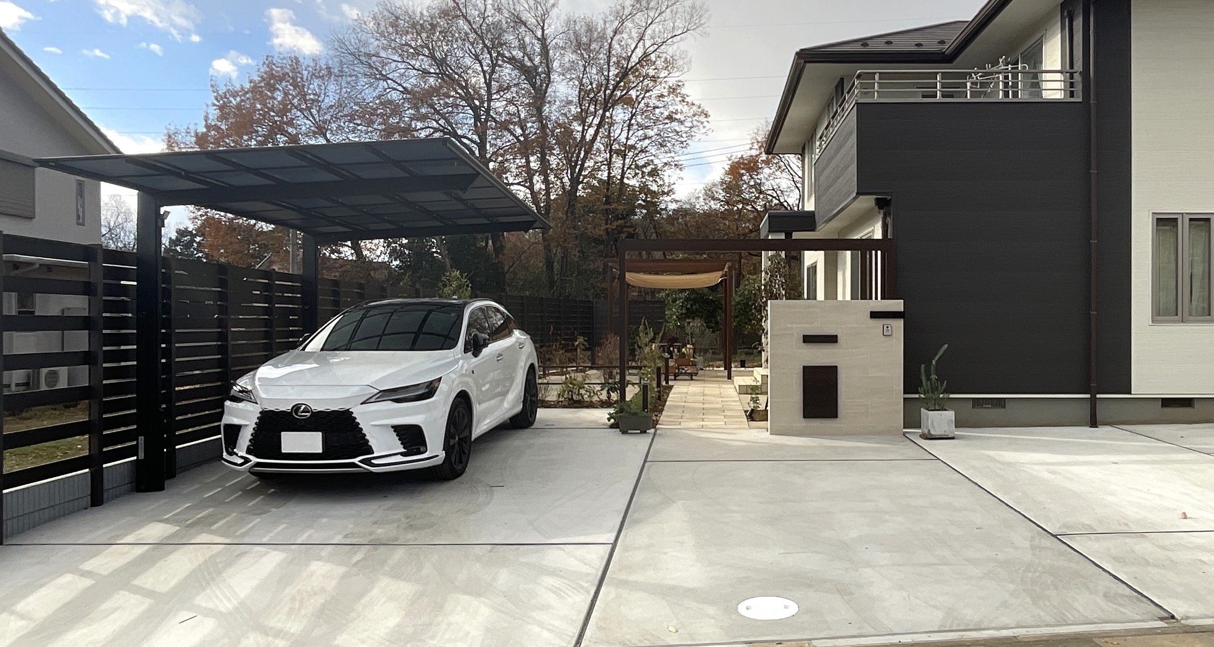 新しい駐車場にはリクシルのカーポート【ネスカF】のブラック色を設置。
