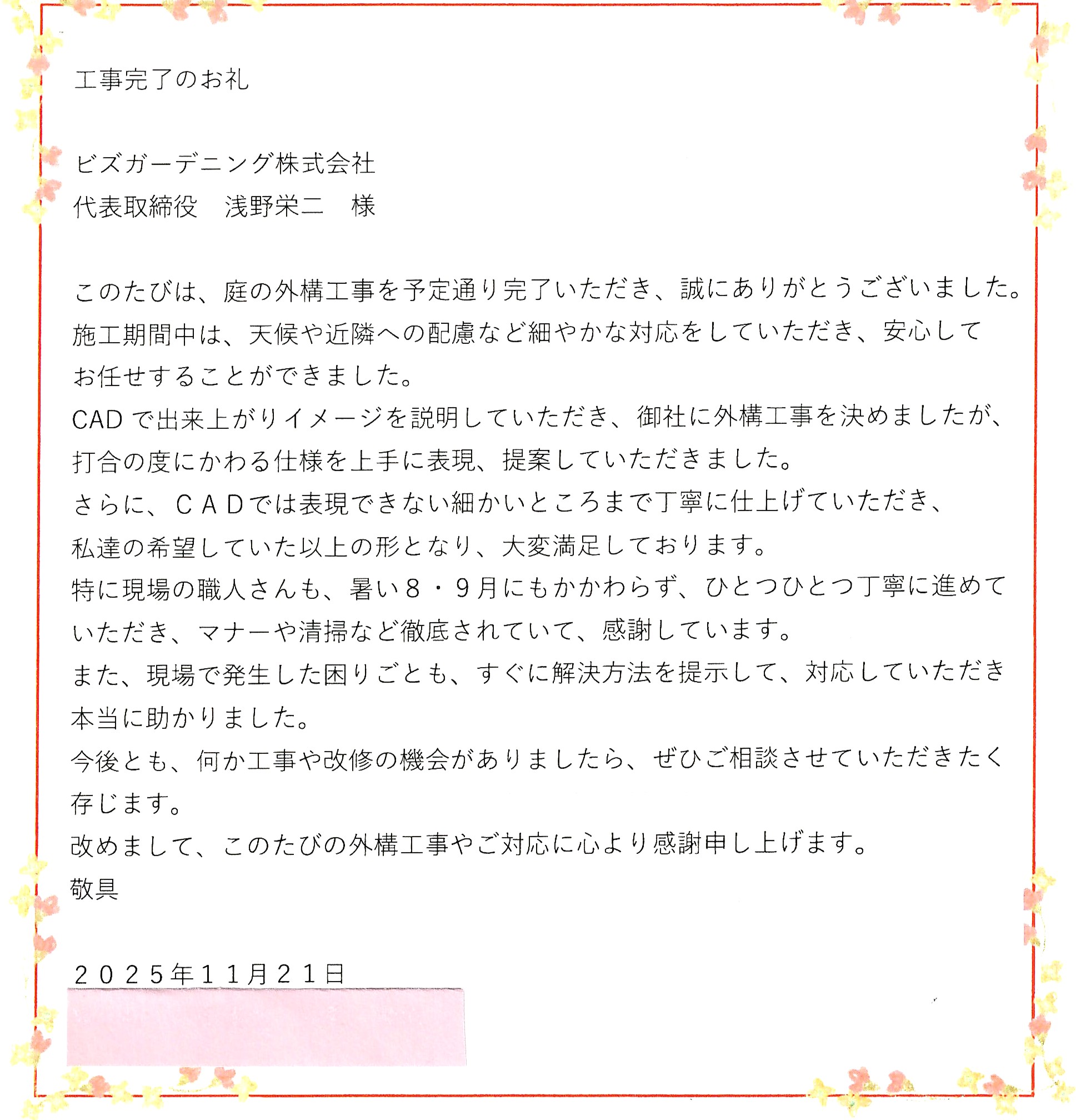 このたびは、庭の外構工事を予定通り完了いただき、誠にありがとうございました。