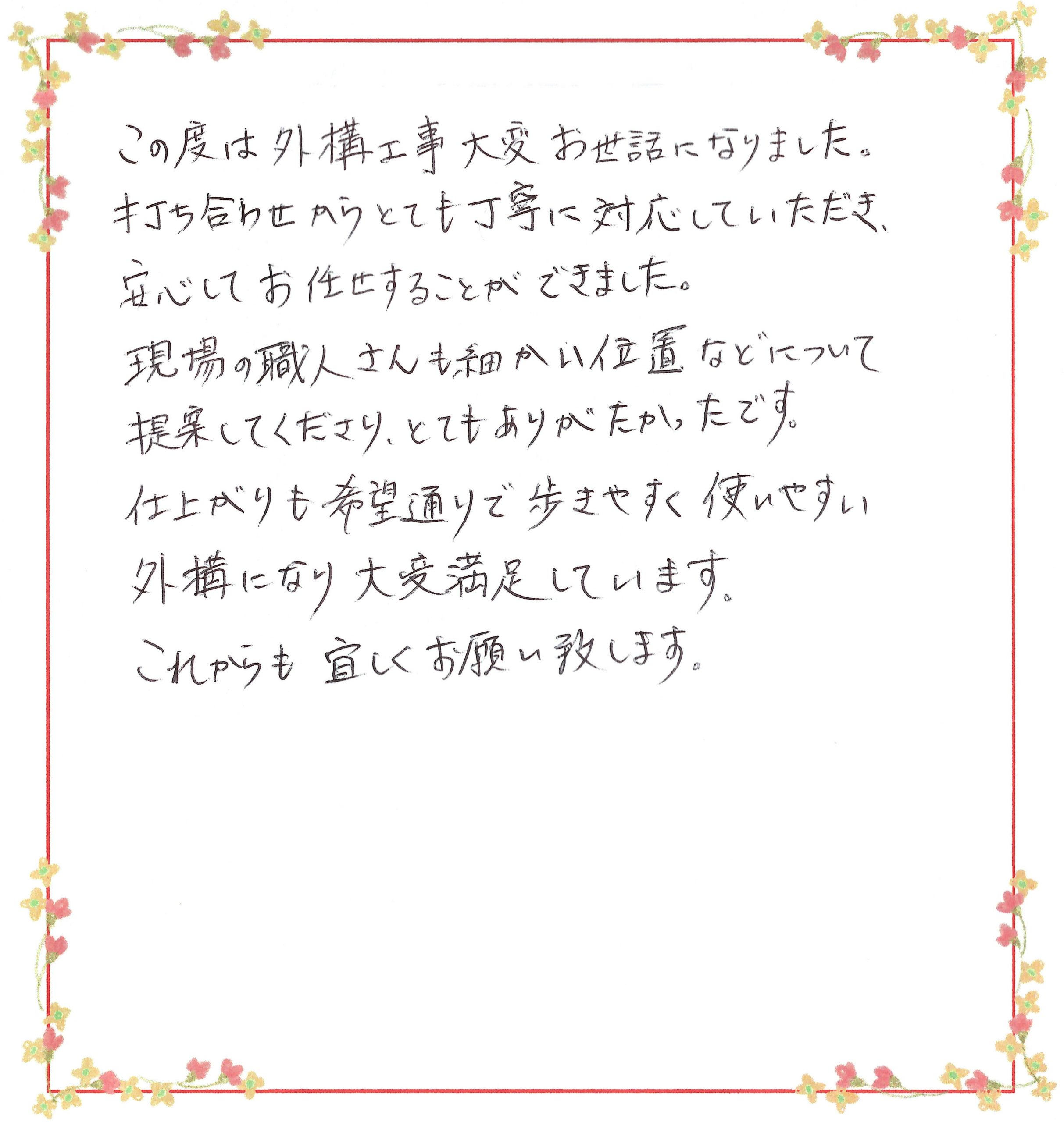仕上がりも希望通りで歩きやすく使いやすい外構になり大変満足しています。